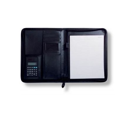 Diplomatka A4 se zavíráním na zip. Imitace kůže, matná. Vybavení: blok, kalkulačka, kapsička na vizitky. Barva černo-hnědá. Prodejní jednotka: 1 ks