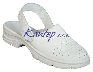 Obuv, dámská, celokožená s plnou špicí , perforovaná s páskem kolem paty, barva bílá. svršek z přírodní lícové úsně, antistatická, protiskluzová PU podešev
