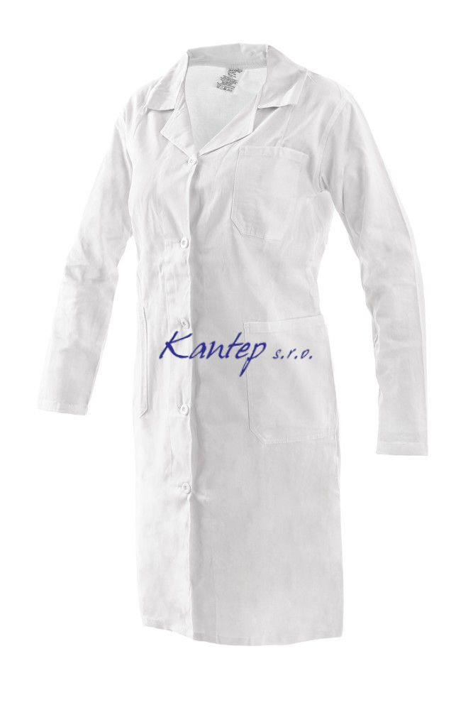 Dámský plášť s dlouhým rukávem, 3 kapsy, vzadu volný pásek s knoflíkem na stáhnutí,materiál- plátno 100% bavlna, barva- bílá.